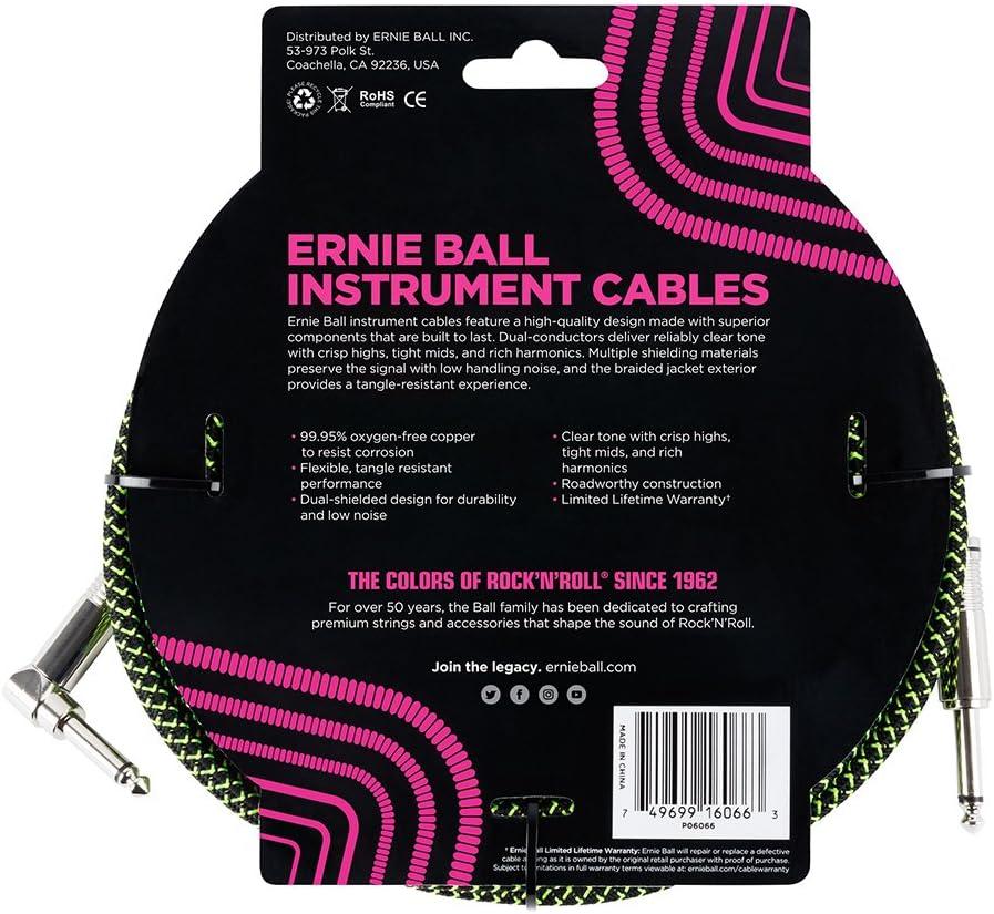 Ernie Ball Braided Instrument Cable, Straight/Angle, 10ft, Neon Yellow (P06080)(Neon Green/Black)
