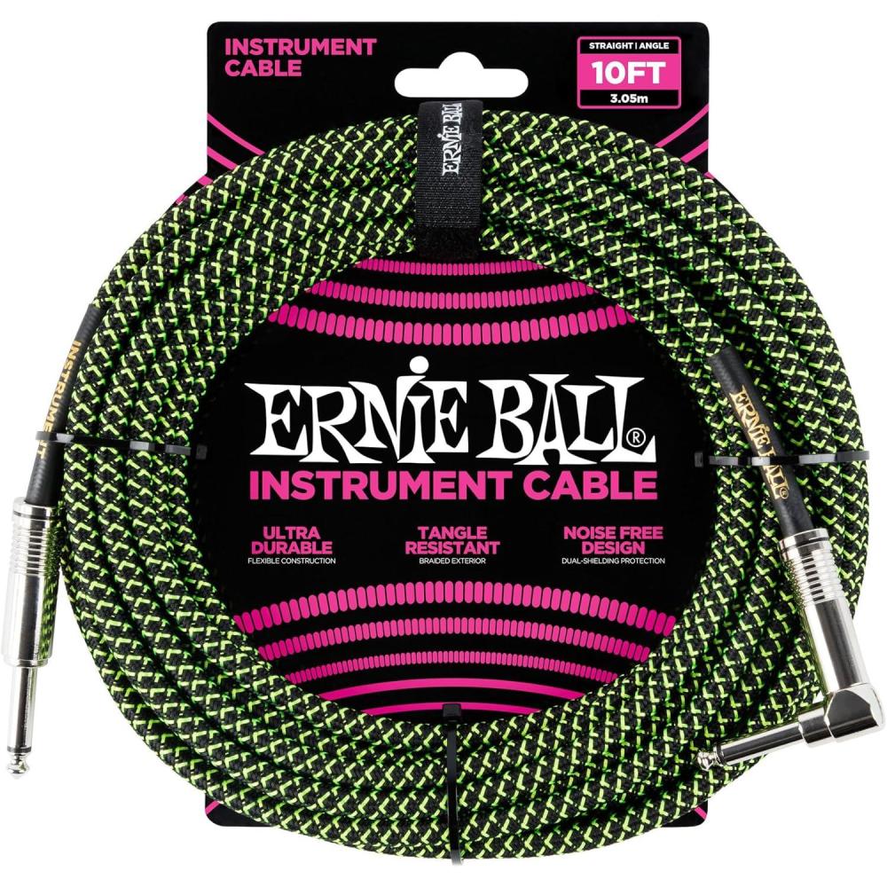 Ernie Ball Braided Instrument Cable, Straight/Angle, 10ft, Neon Yellow (P06080)(Green/Black)