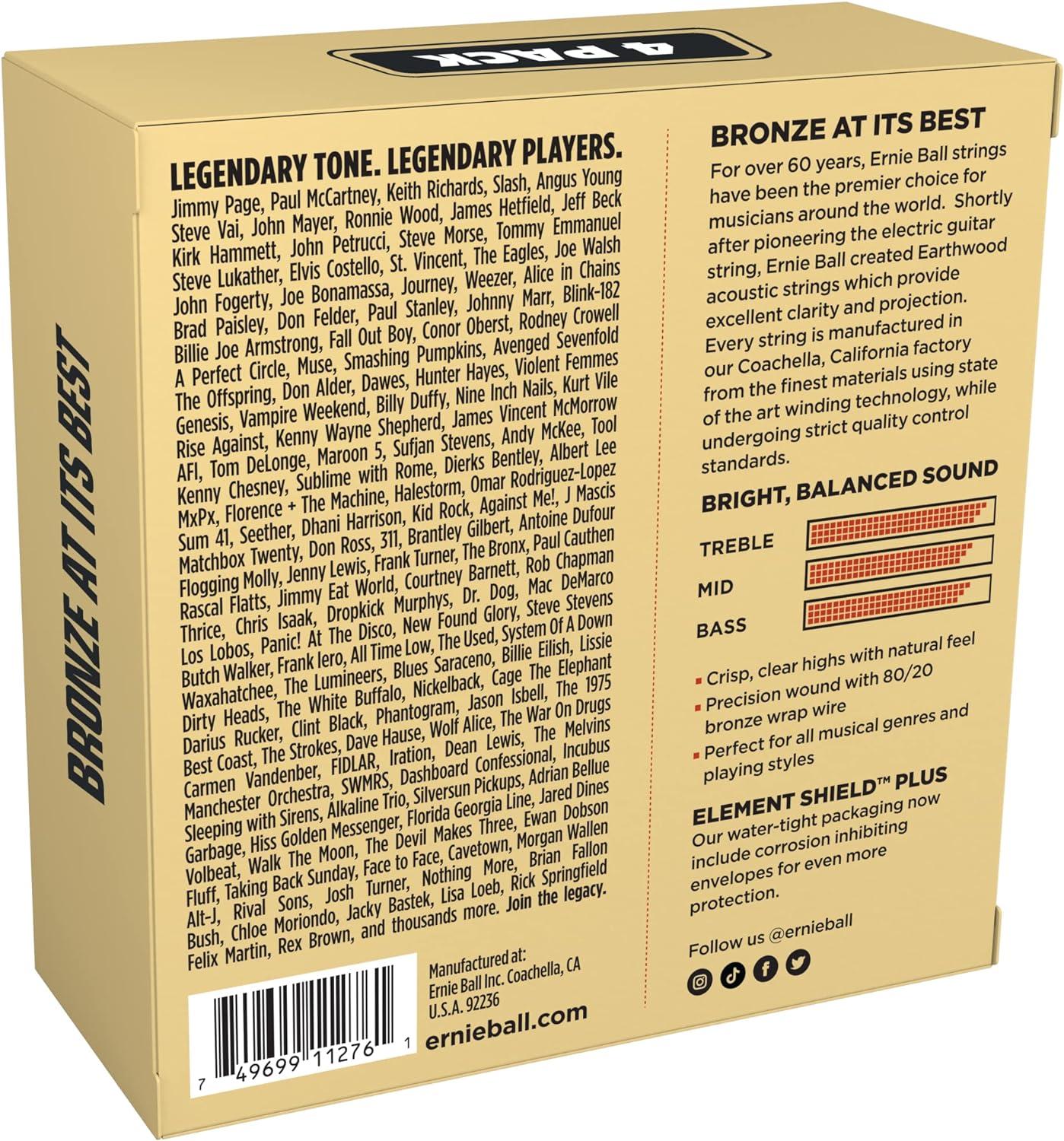 Ernie Ball Earthwood 80/20 Bronze acoustic guitar strings are made from 80% copper, 20% zinc wire wrapped around hex-shaped, brass-plated steel core wire. These acoustic guitar strings produce a bright, balanced sound with pleasing overtones. Gauges .013, .017, .026, .034 .046, .056.