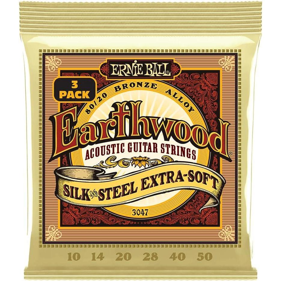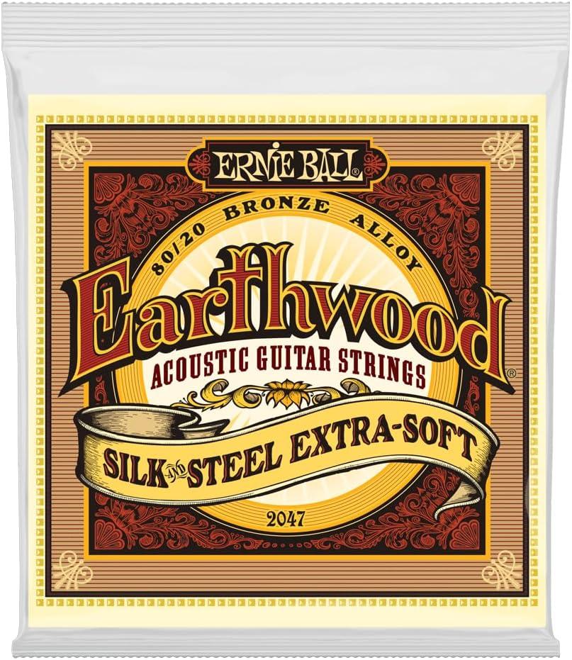 Ernie Ball Ernie Ball Earthwood Silk & Steel Soft 80/20 Bronze acoustic guitar strings are made with an 80/20 bronze alloy wrap, along with a layer of silk between the wrap and steel core. The silk produces a more mellow sound and makes the string feel more comfortable while reducing finger noise. Gauges .009 .009, .012 .012, .020w .009, .026 .012, .036 .020p, .046 .026 Silk & Steel 80/20 Bronze acoustic guitar strings are made with an 80/20 bronze alloy wrap and steel core with a layer of silk in between. The silk produces a more mellow sound and makes the string feel more comfortable while reducing finger noise. Like our standard 80/20 bronze sets, tone is bright, yet slightly mellowed, while tension is also slightly lessened. Available in Extra Soft (10-50), Soft (11-52), Regular (13-56), and 12-String Soft (9-46).