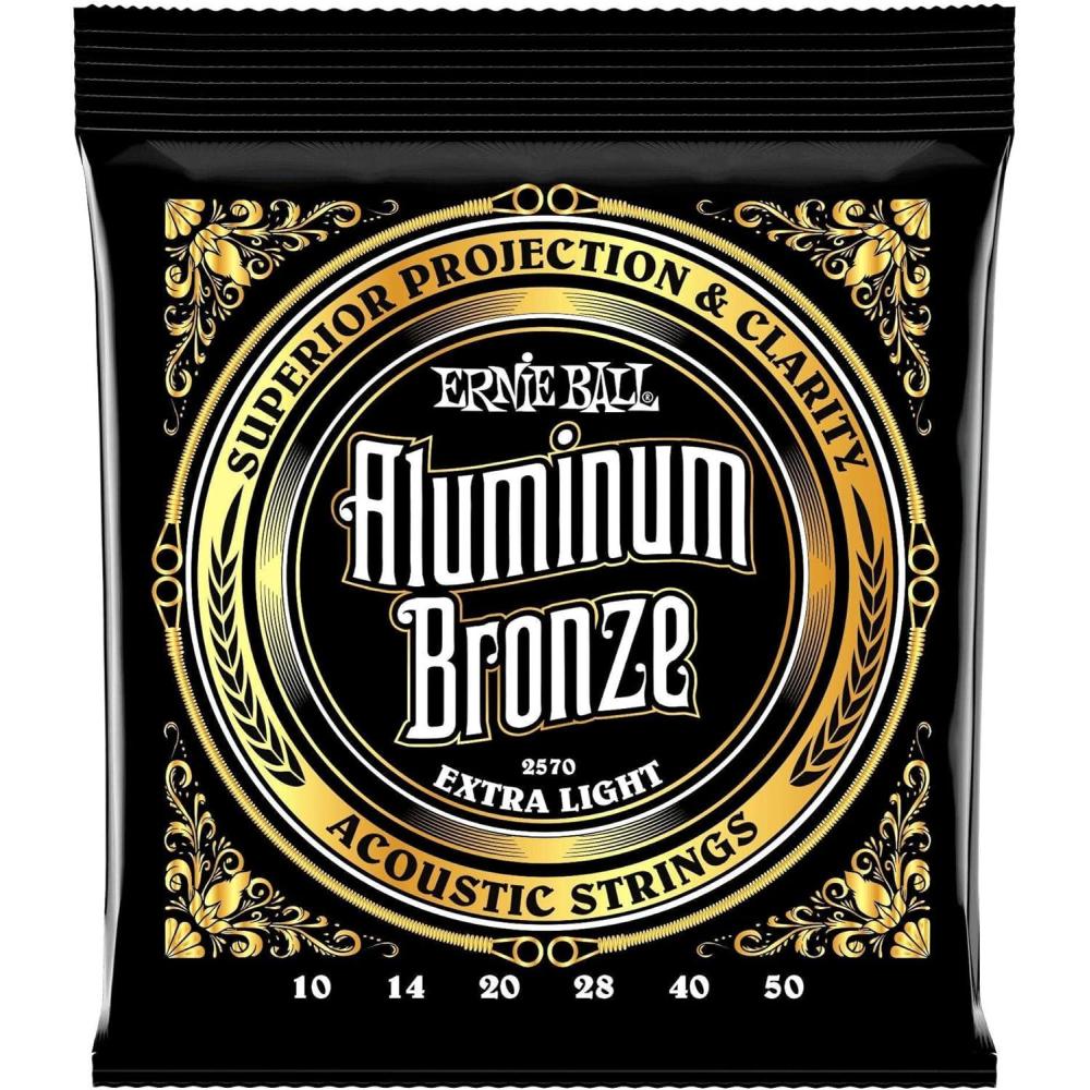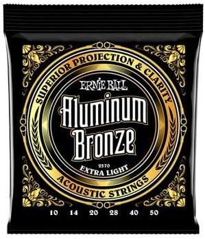 Ernie Ball Aluminum Bronze Acoustic Guitar Strings feature more projection and clarity than traditional bronze strings while also providing improved corrosion resistance. Aluminum Bronze Acoustic strings are made with Ernie Ball Maraging Steel hex-cores and Aluminum Bronze wrap wire, providing more pronounced lows coupled with crisp brilliant highs. Made from a blend of copper and aluminum specifically tailored for acoustic guitar strings. Extra Light gauge .010, .014, .020, .028, .040, .050.