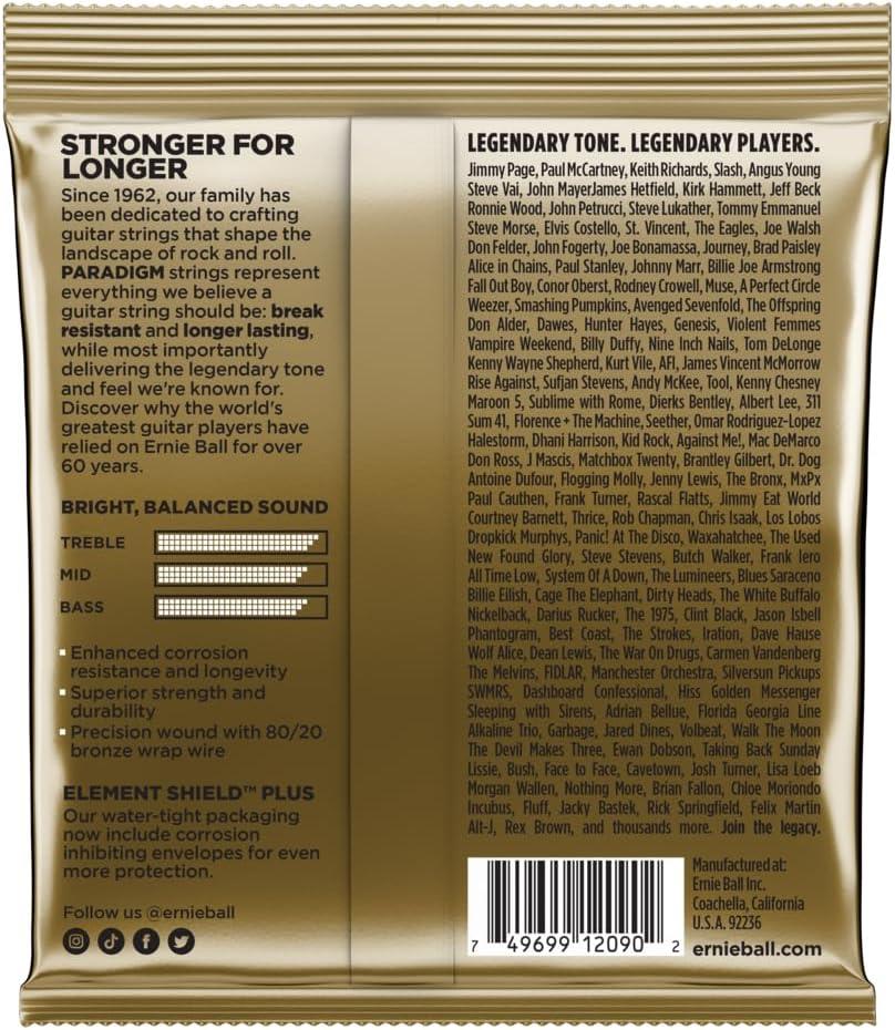 Ernie Ball Slinky Paradigm acoustic guitar strings are the strongest, most break-resistant guitar strings on the market. The result of our half-century mission to create the most toneful and long-lasting acoustic guitar strings, Paradigm sets offer the iconic Earthwood tone and feel you insist on for the stage and studio. Underpinning each Paradigm string is state-of-the-art construction for the ultimate strength and lifespan, however punishing your schedule and playing style. Available in both 80/20 bronze and phosphor bronze.