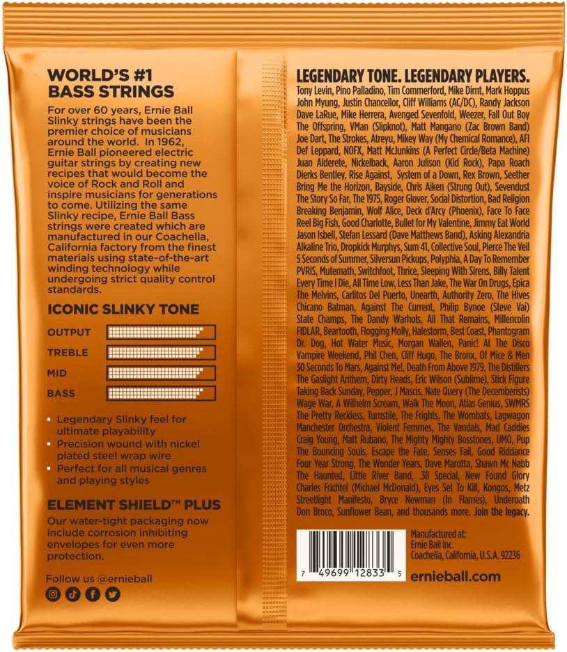 Ernie Ball Roundwound Power Slinky bass guitar strings are made from nickel-plated steel wrapped around a hex-shaped steel core wire. Each bass guitar string produces a bright, balanced tone and is manufactured with the freshest and finest raw materials in the beautiful Coachella Valley of Southern California. Gauges .055, .075, .090, .110.