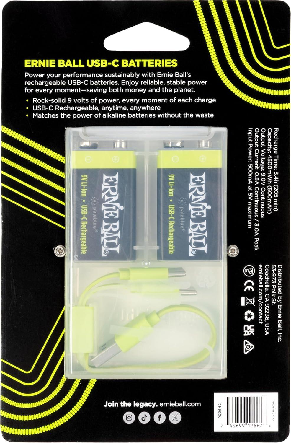 Ernie Ball USB-C rechargeable batteries by Paleblue are sustainable, high-performance lithium-ion batteries designed for musicians and everyday use. Available in 9V and AA formats, they provide constant, full-power output and recharge quickly via USB-C. These batteries reduce waste, save money over time, and are ready for use across musical gear, wireless packs, pedals, and general household devices. 9V is part number P09642.